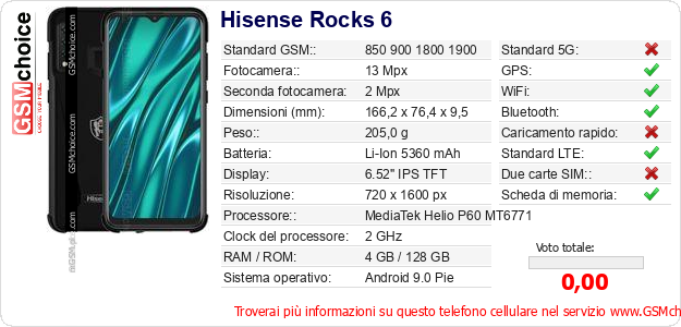 Dati del telefono cellulare Hisense Rocks 6 sul tuo sito