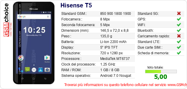 Dati del telefono cellulare Hisense T5 sul tuo sito