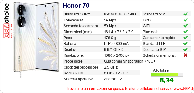 Dati del telefono cellulare Honor 70 sul tuo sito