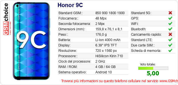Dati del telefono cellulare Honor 9C sul tuo sito