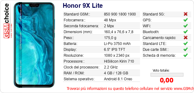 Dati del telefono cellulare Honor 9X Lite sul tuo sito
