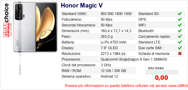 Dati del telefono cellulare Honor Magic V sul tuo sito