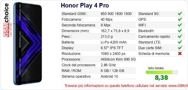 Dati del telefono cellulare Honor Play 4 Pro sul tuo sito