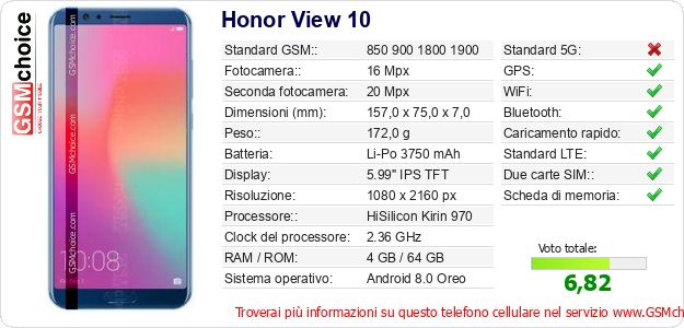 Dati del telefono cellulare Honor View 10 sul tuo sito