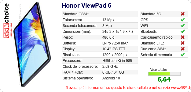 Dati del telefono cellulare Honor ViewPad 6 sul tuo sito