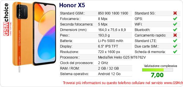 Dati del telefono cellulare Honor X5 sul tuo sito