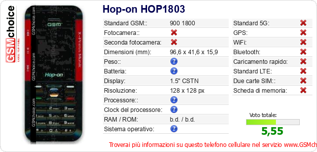 Dati del telefono cellulare Hop-on HOP1803 sul tuo sito