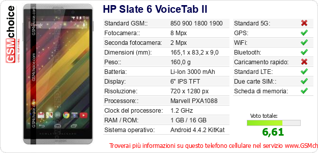 Dati del telefono cellulare HP Slate 6 VoiceTab II sul tuo sito
