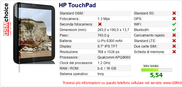 Dati del telefono cellulare HP TouchPad sul tuo sito