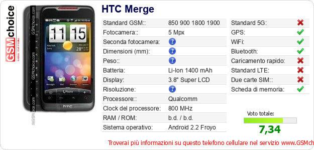 Dati del telefono cellulare HTC Merge sul tuo sito