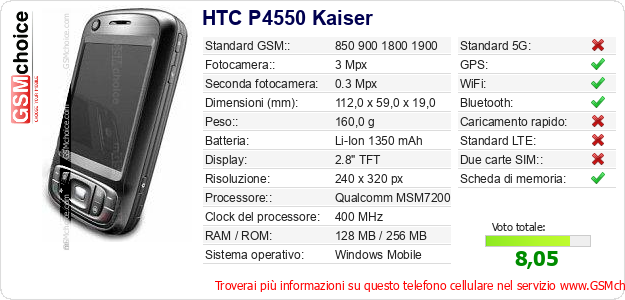 Dati del telefono cellulare HTC P4550 Kaiser sul tuo sito