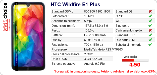 Dati del telefono cellulare HTC Wildfire E1 Plus sul tuo sito