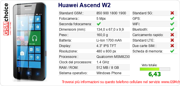 Dati del telefono cellulare Huawei Ascend W2 sul tuo sito