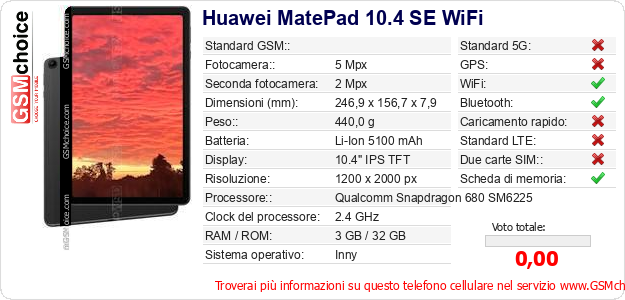 Dati del telefono cellulare Huawei MatePad 10.4 SE WiFi sul tuo sito