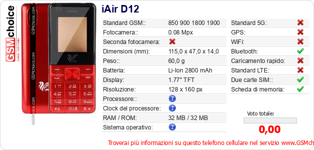Dati del telefono cellulare iAir D12 sul tuo sito