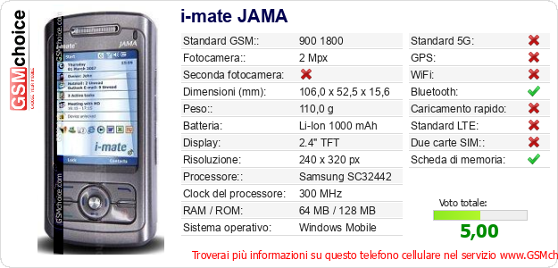 Dati del telefono cellulare i-mate JAMA sul tuo sito