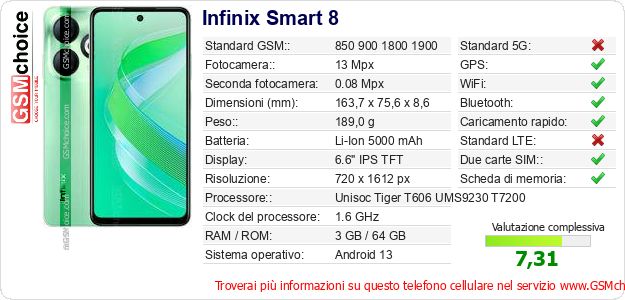 Dati del telefono cellulare Infinix Smart 8 sul tuo sito