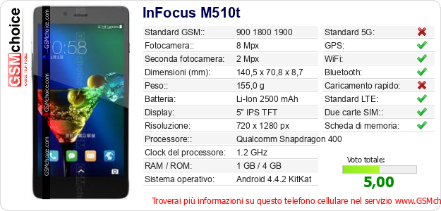 Dati del telefono cellulare InFocus M510t sul tuo sito