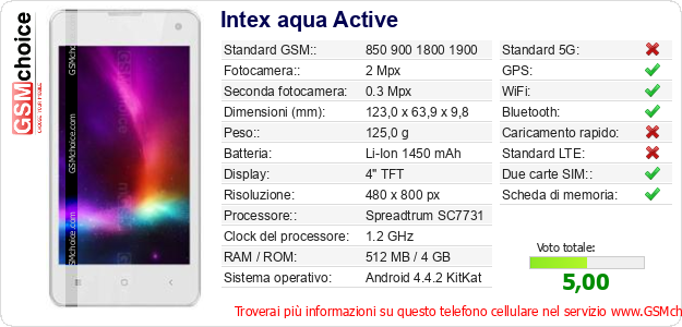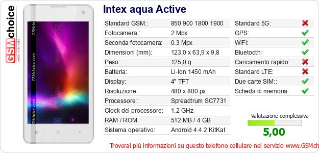 Dati del telefono cellulare Intex aqua Active sul tuo sito