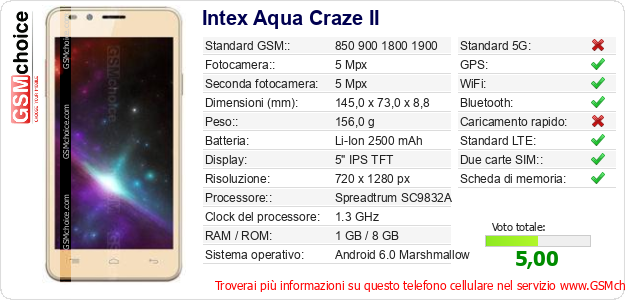 Dati del telefono cellulare Intex Aqua Craze II sul tuo sito