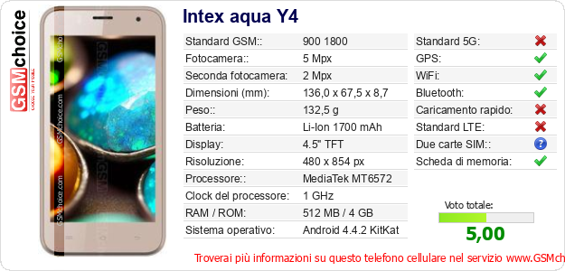 Dati del telefono cellulare Intex aqua Y4 sul tuo sito
