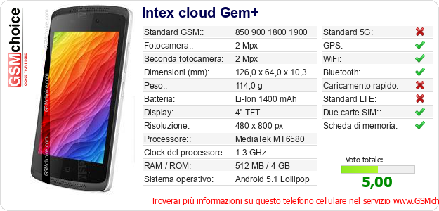 Dati del telefono cellulare Intex cloud Gem+ sul tuo sito