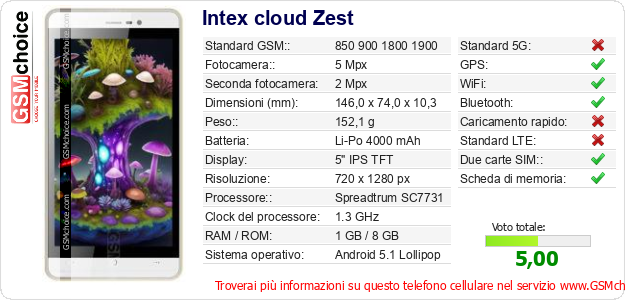 Dati del telefono cellulare Intex cloud Zest sul tuo sito