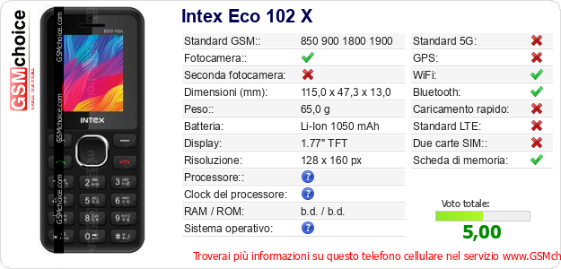 Dati del telefono cellulare Intex Eco 102 X sul tuo sito