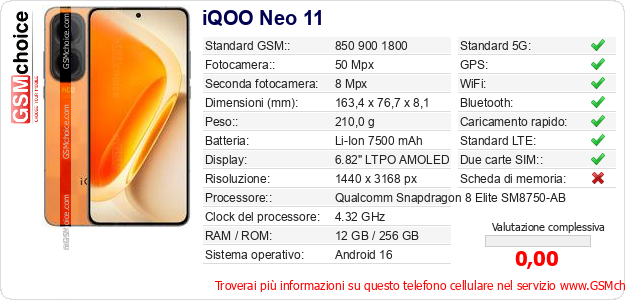 Dati del telefono cellulare iQOO Neo 11 sul tuo sito