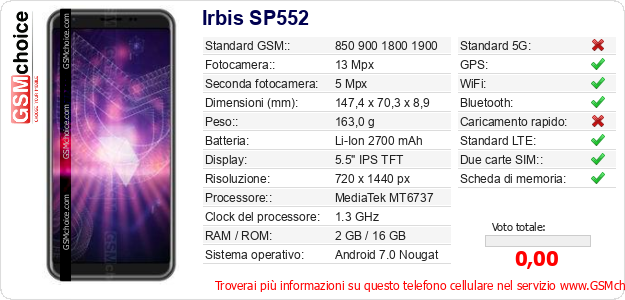 Dati del telefono cellulare Irbis SP552 sul tuo sito