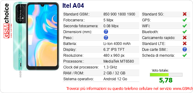 Dati del telefono cellulare Itel A04 sul tuo sito