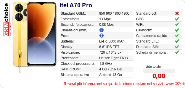 Dati del telefono cellulare Itel A70 Pro sul tuo sito