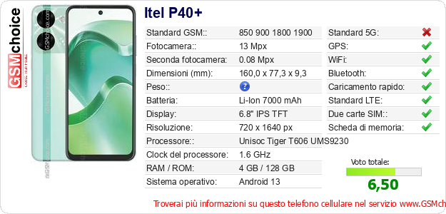 Dati del telefono cellulare Itel P40+ sul tuo sito