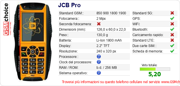 Dati del telefono cellulare JCB Pro sul tuo sito