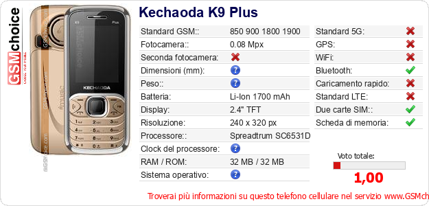 Dati del telefono cellulare Kechaoda K9 Plus sul tuo sito