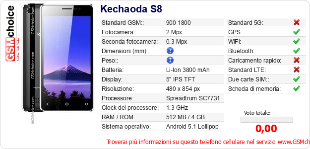 Dati del telefono cellulare Kechaoda S8 sul tuo sito