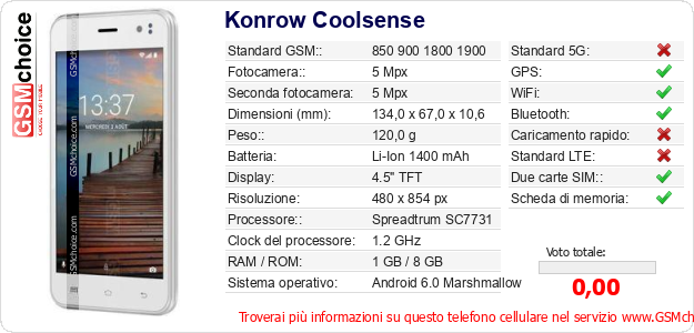 Dati del telefono cellulare Konrow Coolsense sul tuo sito