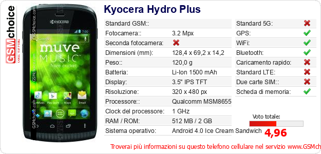 Dati del telefono cellulare Kyocera Hydro Plus sul tuo sito