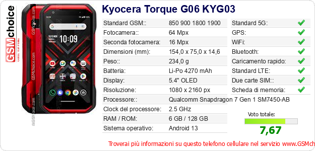 Dati del telefono cellulare Kyocera Torque G06 KYG03 sul tuo sito