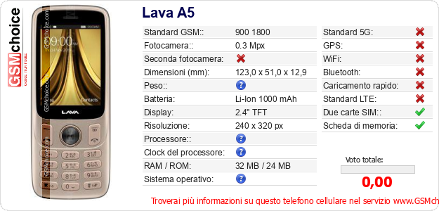 Dati del telefono cellulare Lava A5 sul tuo sito