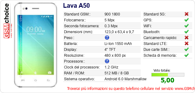 Dati del telefono cellulare Lava A50 sul tuo sito