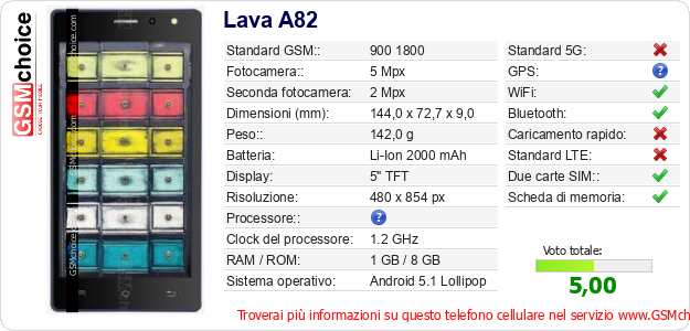 Dati del telefono cellulare Lava A82 sul tuo sito