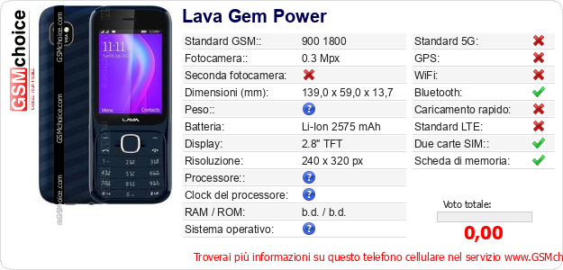 Dati del telefono cellulare Lava Gem Power sul tuo sito