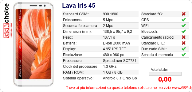 Dati del telefono cellulare Lava Iris 45 sul tuo sito