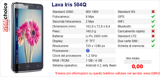 Dati del telefono cellulare Lava Iris 504Q sul tuo sito