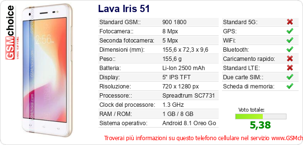 Dati del telefono cellulare Lava Iris 51 sul tuo sito