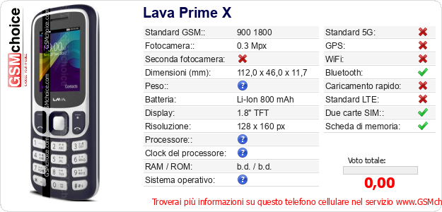 Dati del telefono cellulare Lava Prime X sul tuo sito