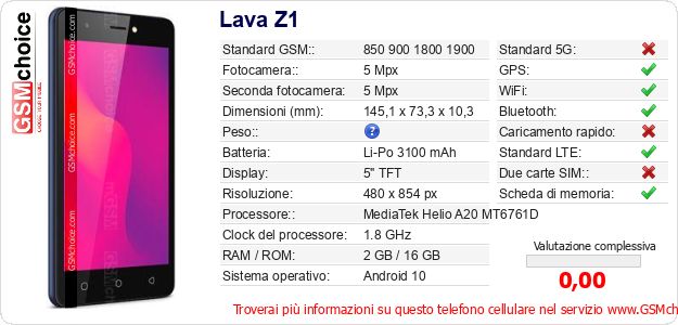 Dati del telefono cellulare Lava Z1 sul tuo sito