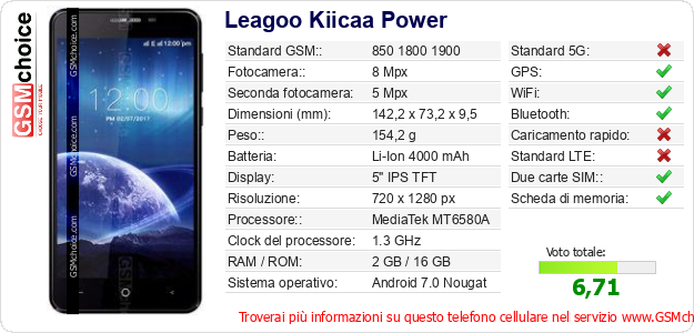 Dati del telefono cellulare Leagoo Kiicaa Power sul tuo sito