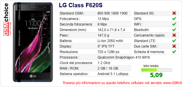 Dati del telefono cellulare LG Class F620S sul tuo sito